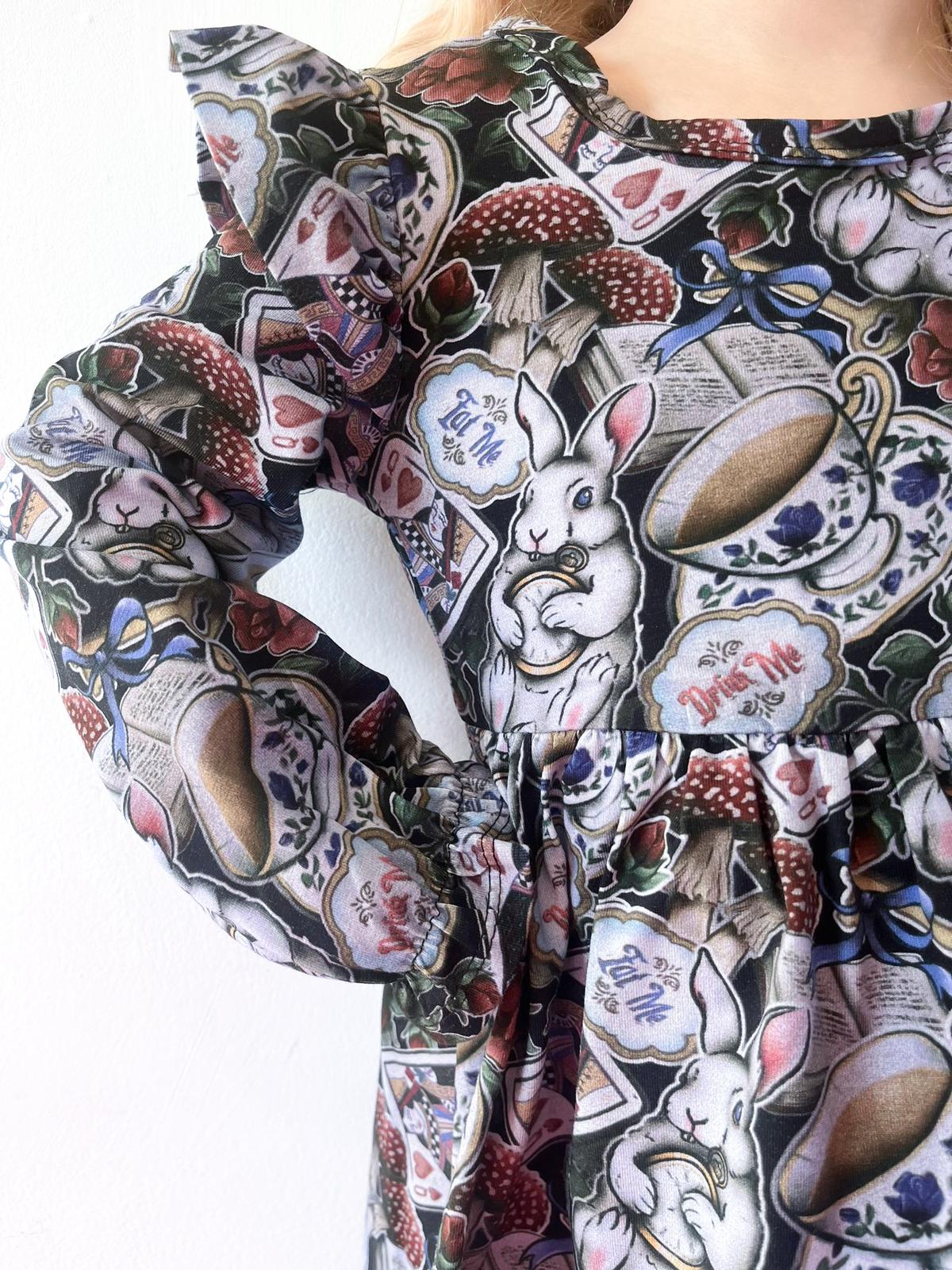 🐇 “Wonderland Whimsy Ruffle Dress” – Tea, Toadstools & Curious Adventures